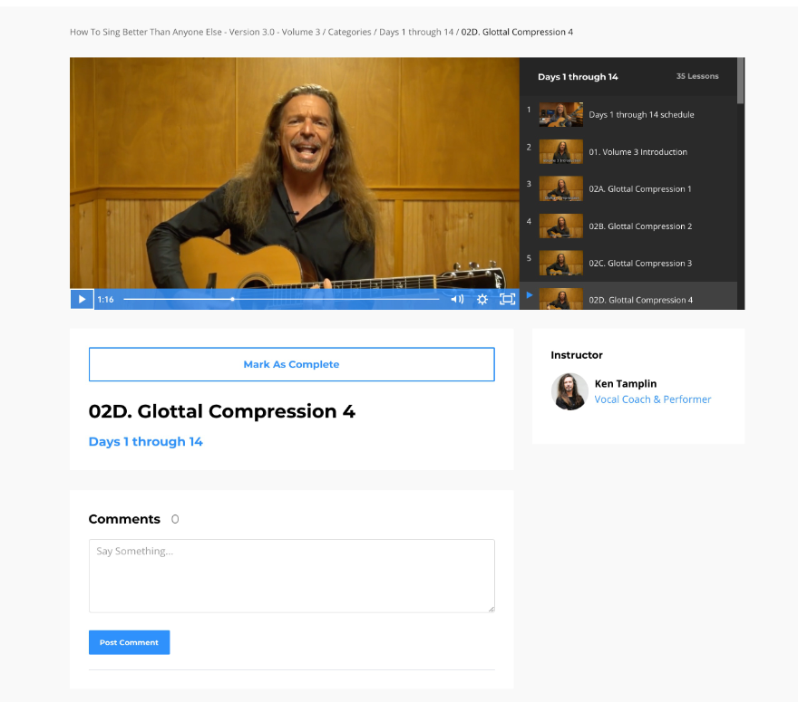 Ken Tamplin Vocal Academy has just one course: How To Sing Better Than Anyone Else, oftentimes abbreviated to HTS. The latest version is 3.0 and available through streaming only. HTS Version 2.0 is still available in USB and DVD formats but is not available in streaming format.
